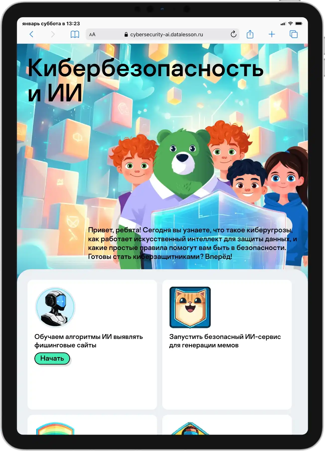 - Задачи с drag-and-drop, сортировкой данных, созданием паролей, распознаванием фишинга и другими киберугрозами с элементами геймификации.